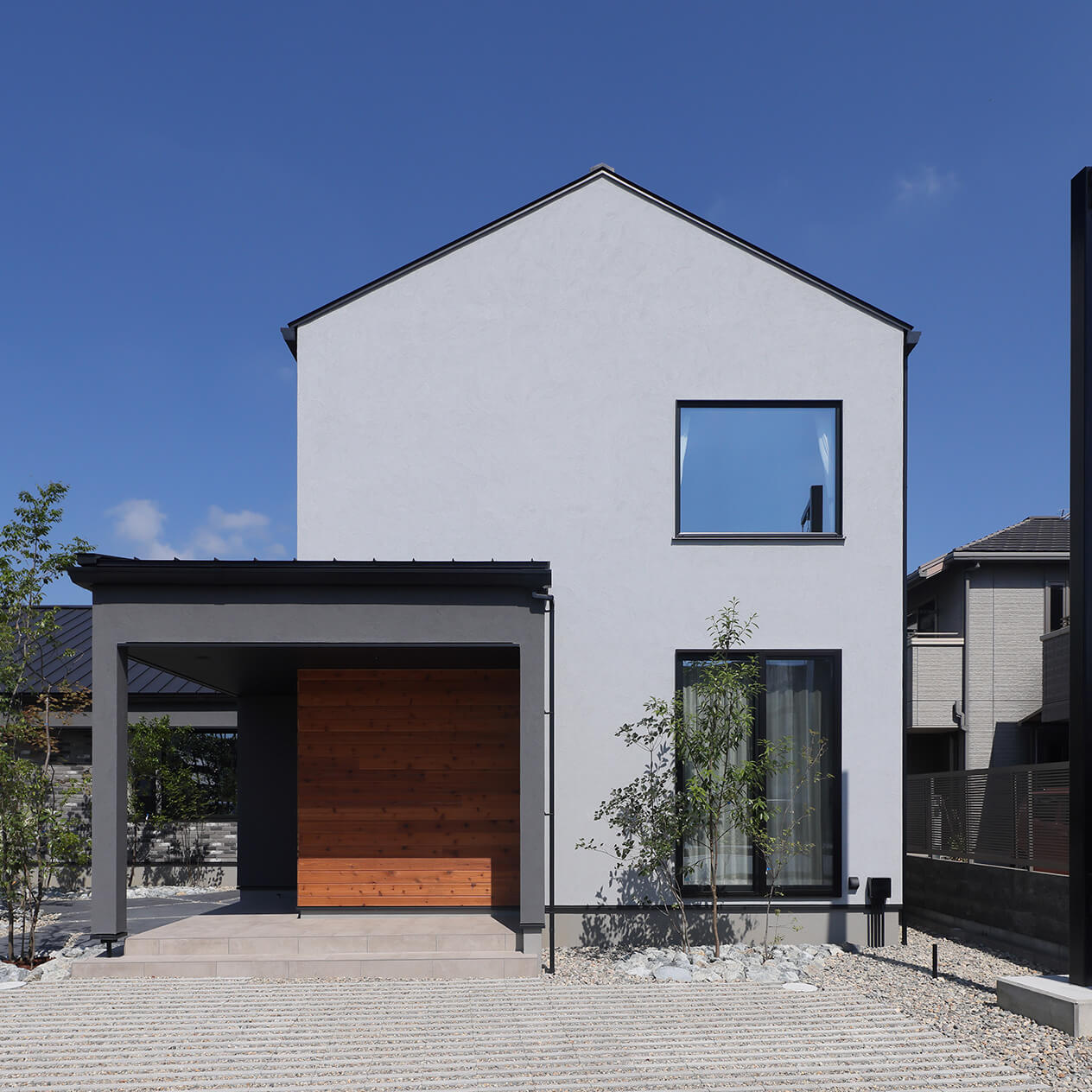 LDKから繋がる中庭ウッドデッキは、解放感がある安らぎのセミプライベート空間。玄関までのアプローチに面し、家の中への期待を高めてくれる。