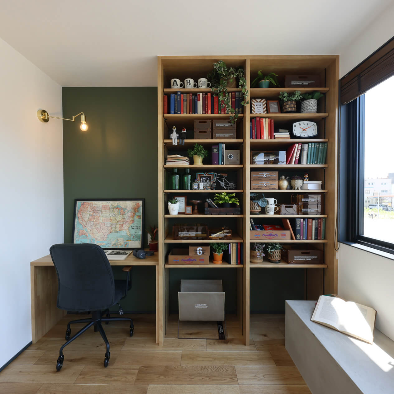 主寝室の一角のカウンターデスクは、テレワーク、読書や趣味のための空間としても使い勝手の良いスペース。アルミフレームの室内窓が空間を引き締め、遊び心とリラックス感のある雰囲気に。